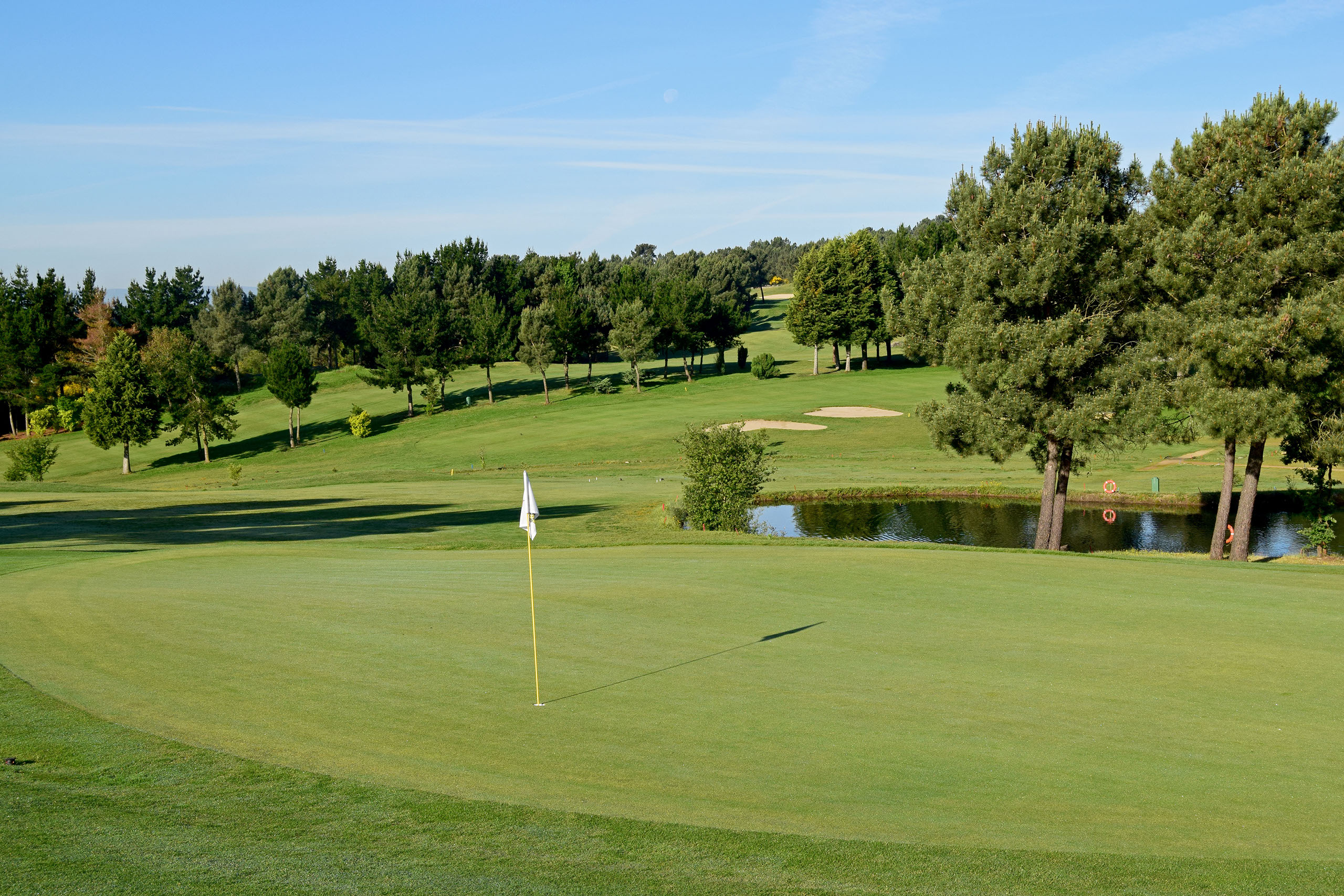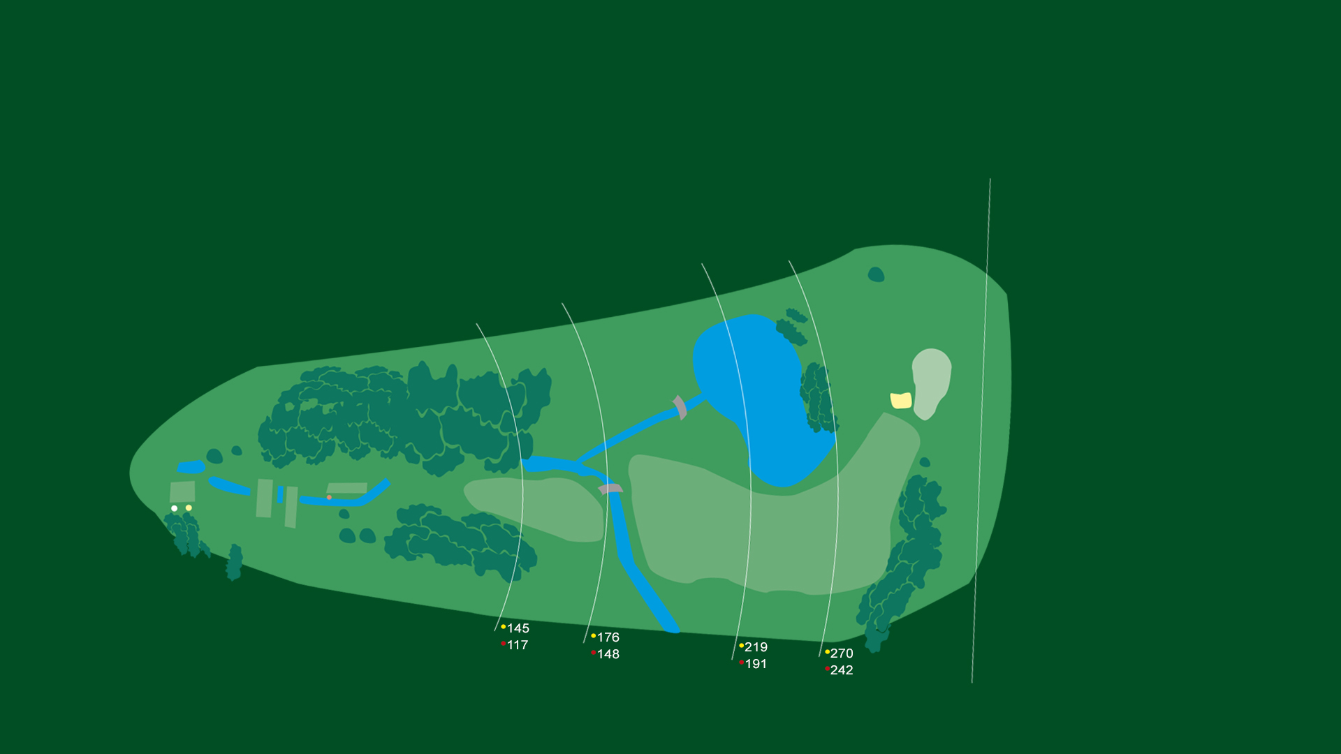 Salida comprometida por un regato y un lago. Complicado green en alto con dos plataformas y un bunker.